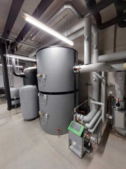Für die Wärme- und Kälteversorgung wurde eine energieeffiziente Wärmepumpe mit einer Heizleistung von 120kW und einer Kälteleistung von 150kW, sowie ein Spitzenlastkessel mit einer Leistung von 170kW installiert.