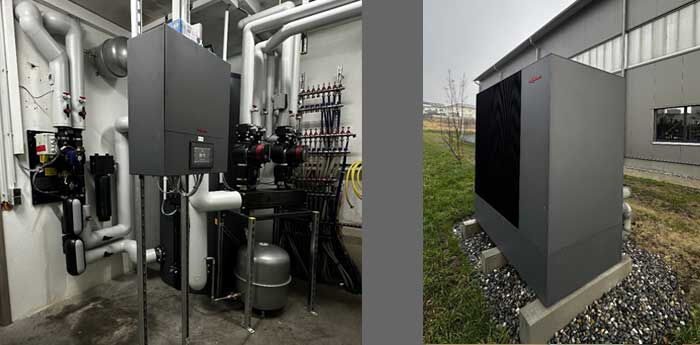 Inneneinheit und Außeneinheit Wärmepumpe 40 kW Gewerbehalle Bad Schussenried -