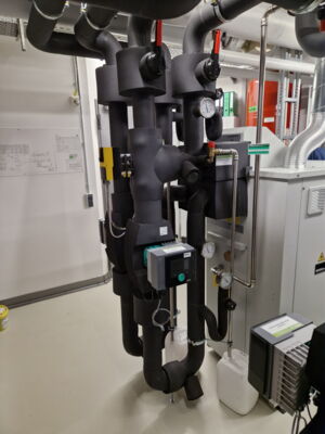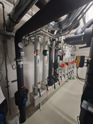 Heizkreisverteiler / Dampfanlage (Heizen mit Betonkernaktivierung, Fußbodenheizung, Heizkörper, Heizlüfter - Kühlung über Fußbodenheizung + Betonkernaktivierung)