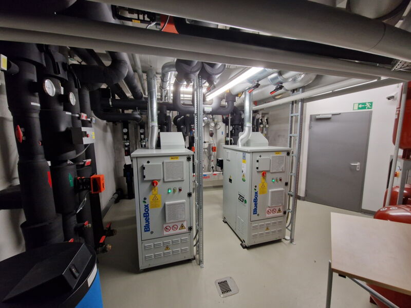 und einer Kälteleistung von 150kW, sowie ein Spitzenlastkessel mit einer Leistung von 170kW installiert.