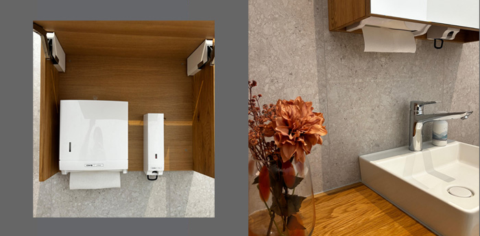 Spiegelschrank mit integriertem Seifen- und Papierspender, Küchenstudio Fischbach -