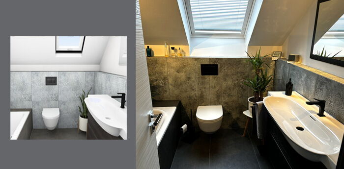 Planungsansicht und Original - Fliesen in Vintage-Optik, moderner Waschtisch und WC-Keramik von Laufen
