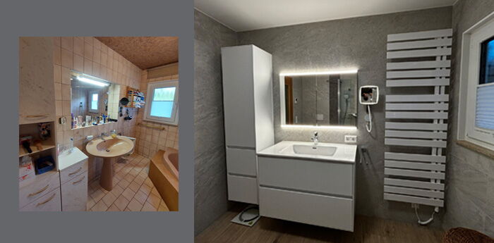 Vorher/Nachher - Waschtisch mit Unter- + Seitenschrank, Keuco Spiegelschrank + Kosmetikspiegel -