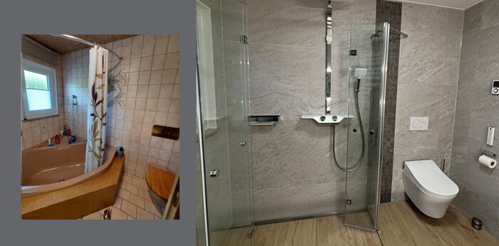 Vorher/Nachher - Barrierefreie und bodenebene Dusche gefliest, raumhoch in Steinoptik, Holzoptik Fliesen am Boden
