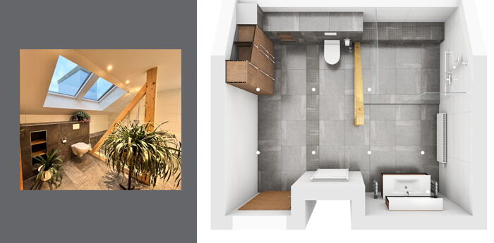 Planungsansicht von oben, seniorengerechtes Bad mit extra großer Dusche -
