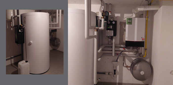 Wärmeseitig werden die Gebäude mit vier Gasbrennwertgeräten in Kaskade und einer Gesamtheizleistung von 1160 kW versorgt.
